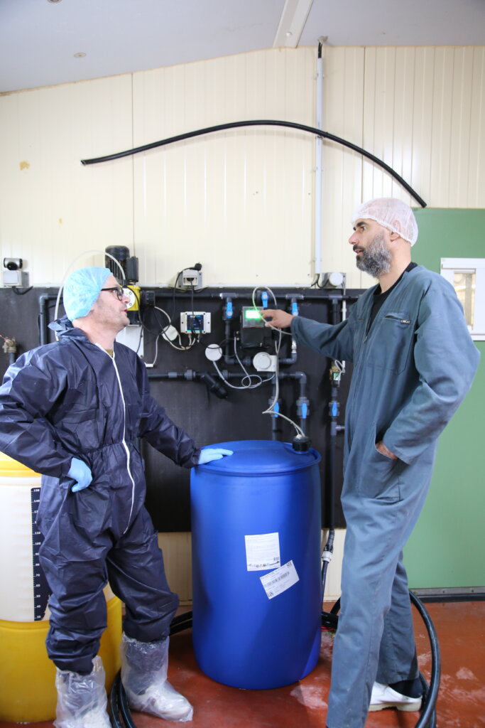 Avant la mise en route du forage, Laurent procède à un nettoyage mécanique des canalisations (injection d’air et d’eau sous pression). Un entretien du déferriseur est alors conseillé pour réduire les quantités de fer (de 320 à 51 μg/L) et de manganèse (de 292 à 35 μg/L). Ensuite, il faut potabiliser l’eau destinée aux volailles : « nous avons d’abord fait des analyses physico-chimiques pour choisir le bon désinfectant. » Une désinfection par chloration (DCCNa) est ainsi réalisée et une cuve de stockage de 10 m3 est installée. Toutefois, à ce stade, le pH de l’eau s’avère trop élevé à la sortie du déferriseur (7,6). Or, ce paramètre peut nuire à la bonne digestibilité des aliments, avec un risque accru de fientes liquides. Il prescrit donc une acidification de l’eau et des pompes doseuses adaptées pour injecter ce type de produits. Actuellement, un mélange d’acide minéral et d’acides organiques permet d’atteindre cet objectif.
